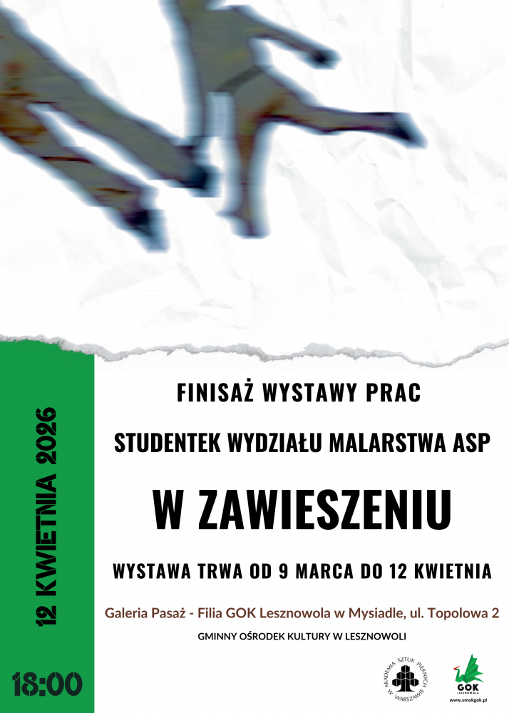 Gminny Ośrodek Kultury w Lesznowoli oraz Akademia Sztuk Pięknych w Warszawie zapraszają na wystawę studentek Wydziału Malarstwa: Natalii Borowej, Martyny Lipskiej, Antoniny Zielińskiej, Olgi Żebrowskiej.