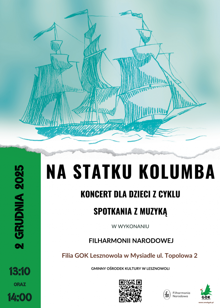Zapraszamy na koncert Na statku Kolumba z cyklu "Spotkania z muzyką" w wykonaniu Filharmonii Narodowej. Wydarzenie odbędzie się 2 grudnia 2025 w godz. 13.10 oraz 14.00 (2 grupy) w filii GOK Lesznowola w Mysiadle, ul. Topolowa 2